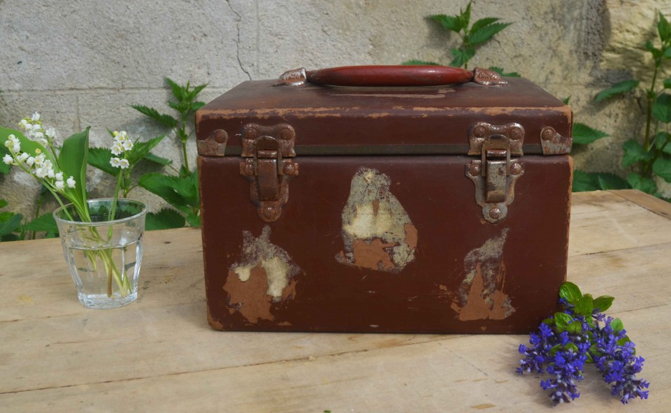 Bruin kinderkoffertje met kersjesKoffertje, dat waarschijnlijk van een Frans kindje is geweest: kersjes-papier van binnen, buiten nog de afdruk van poezieplaatjes. Warm bruin van kleur, met wat versleten plekjes, sfeervol. Formaat: 26cm L x 19cm B x 16cm H Op voorraad: Nee |